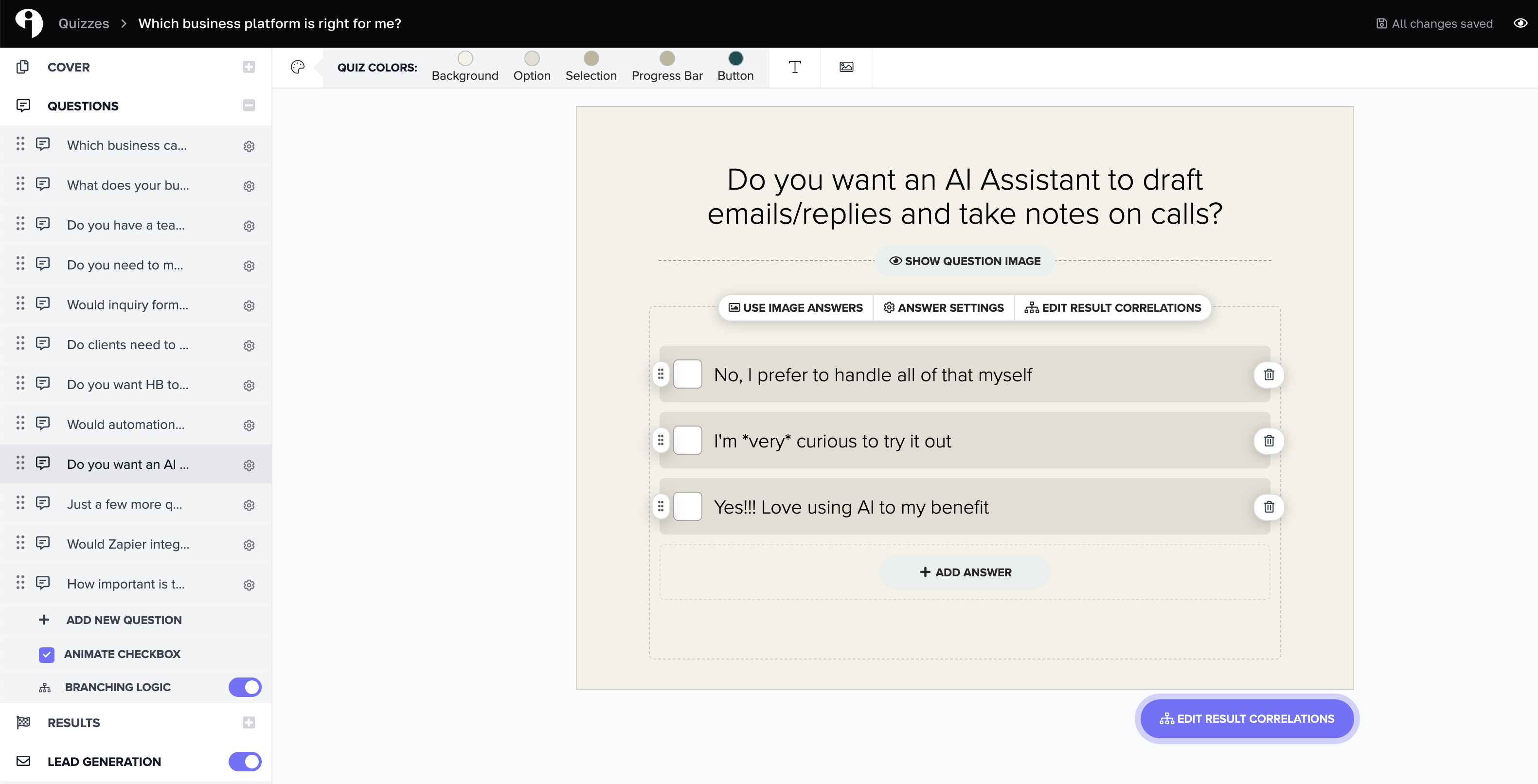 Then the quiz loads into your account and you can edit, connect to your email list, and publish. This takes the quiz building process from several weeks at best down to an hour or two, and answers the biggest question our customers have because we’re showing you the best quiz for your business.