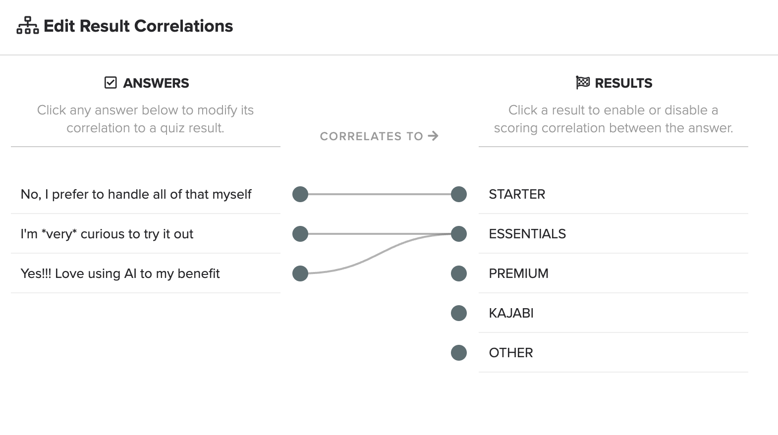- I added the questions and connected each answer to a specific result using Interact’s backend logic.